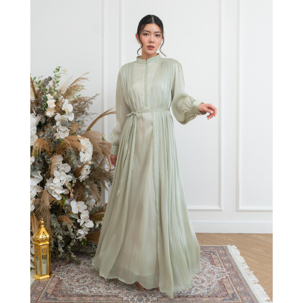 Outer shimmering bergaya Turki dari Pici.Jen ini juga cocok dijadikan outfit lebaran yang santai namun tetap terlihat mewah. Terdapat kain pengikat di bagian tengah perut, outer berbahan sheer shimmering ini memiliki banyak sekali pilihan warna seperti sky blue, white, navy, flame, rosequartz, emerald, hingga abu. Harganya dibanderol mulai dari Rp145.000 hingga Rp189.000 tergantung warna dan ukuran lingkar dada.