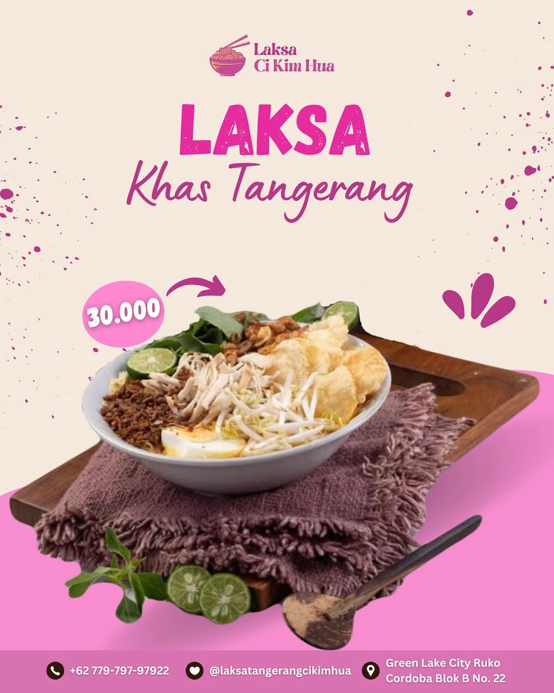 Laksa Tangerang dikenal sebagai kuliner peranakan yang memadukan cita rasa Tionghoa dan Melayu. Salah satu yang wajib dicoba adalah Laksa Ci Kim Hua di foodcourt Perumahan Metro Permata. Tempatnya bersih dan nyaman, menyajikan laksa khas China Peranakan dengan kuah santan kuning yang kental dan harum rempah. Buat pecinta kuliner berkuah creamy dan kaya rasa, laksa ini wajib masuk daftar cobaan kuliner nostalgia.