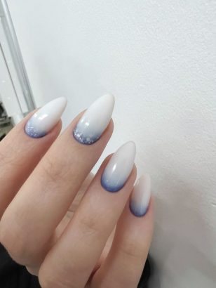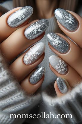 Memanfaatkan teknik ombre yang populer untuk menciptakan efek salju yang turun. Desain kuku ini berfokus pada suasana dingin dan damai, menggunakan teknik ombre yang modern alih-alih pola yang dilukis secara manual. Kombinasi putih, perak, dan biru tua sangat pas untuk tema Winter Wonderland.