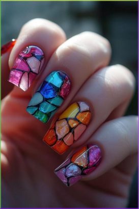 Desain yang lebih detail dan cocok untuk perayaan Natal yang formal. Pilih satu atau dua kuku untuk menjadi kanvas. Gambar pola geometris atau ornamen Natal yang kompleks menggunakan garis-garis hitam tipis (seperti bingkai kaca patri). Isi setiap bagian dengan gel polish transparan berwarna-warni (merah ruby, hijau zamrud, kuning amber). So chic!