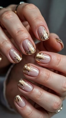 Desain super cepat dan minimalis yang memberikan kesan mewah instan. Ini adalah salah satu nail art simple terbaik untuk Moms yang tidak punya banyak waktu. Kesan emas yang messy tapi mewah memberikan vibes vintage yang elegan dan sangat cocok dipadukan dengan aksesoris Natal Mommies yang chic.