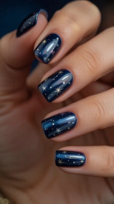 Gunakan warna dasar navy blue (biru tua) yang mewah. Hiasi dengan taburan glitter perak atau lukisan bintang kecil berwarna emas. Ini memberikan kesan musim dingin yang glamor dan dewasa.