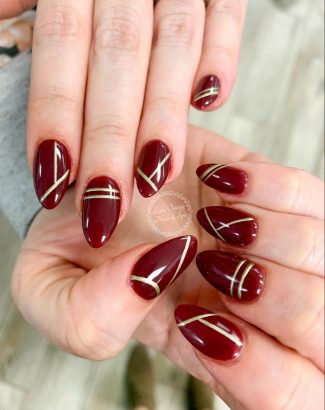 Aplikasikan warna dasar merah atau hijau. Buat garis diagonal yang estetik di setiap kuku. Bermainlah dengan warna gold yang tak pernah gagal memberikan kesan mewah pada desain ini. Tak perlu khawatir bahwa setiap kuku tidak memiliki model atau bentuk garis yang sama. Pengaturan garis yang tidak sama malah bisa membuat nail art simple ini malah menjadi lebih modern dan sangat mudah dilakukan sendiri.