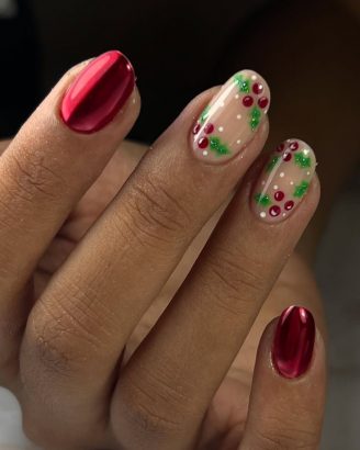 Aplikasikan chrome pada warna merah berry atau marun, lalu tambahkan sentuhan daun holly hijau dan titik merah mini di dekat kutikula untuk aksen yang mewah.