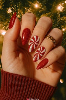 Hadirkan pola permen tongkat merah-putih dengan swirl atau pola gelombang abstrak pada beberapa kuku, sementara kuku lainnya dicat polos merah.