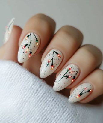 Ide ini berfokus pada elemen botani musim dingin, bukan hanya holly berry yang sudah umum. Desain ini menawarkan tampilan yang terlihat “dingin” dan tenang, jauh dari warna merah mencolok, menjadikannya pilihan nail art simple yang berkelas dan alami.