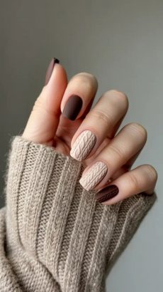 Gunakan gel tebal untuk membuat pola rajutan atau kabel sweter. Pilih warna nude, putih gading, atau burgundy. Ini memberikan tekstur unik yang sangat identik dengan nuansa musim dingin dan kehangatan.