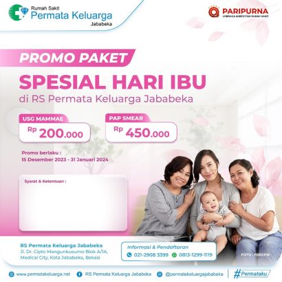 RS Permata Keluarga Jababeka menawarkan promo yang mencakup layanan USG mammae dengan harga Rp200.000 dan Pap Smear seharga Rp450.000. Masing-masing ditujukan untuk deteksi dini kesehatan payudara dan leher rahim, dua masalah kesehatan perempuan yang rentan. Promo berlaku mulai 15 Desember 2023 hingga 31 Januari 2024 dan dapat dimanfaatkan oleh para perempuan yang ingin melakukan pemeriksaan kesehatan secara preventif.
