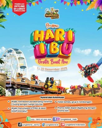 Akhir tahun biasanya waktu untuk jalan-jalan! Nah, ke JungleLand Sentul saja karena ada Promo Hari Ibu. Selama 1–22 Desember 2025, para ibu bisa masuk gratis ke JungleLand. Syaratnya simple, yakni cukup datang ke loket pembelian offline, ajak minimal dua pendamping yang beli tiket dengan harga normal, lalu tunjukkan KTP atau KK (boleh asli atau fotokopi).