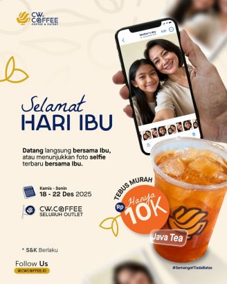 Buat pencinta kopi jangan sampai melewatkan penawaran satu ini. Datang langsung ke CW Coffee atau cukup tunjukkan foto selfie terbaru bersama Ibu, dan nikmati Java Tea spesial hanya Rp10.000 dengan pembelian satu menu apa pun. Promo ini berlaku mulai 18–22 Desember 2025 di seluruh outlet CW Coffee, tidak berlaku kelipatan dan tidak dapat digabung dengan promo lain.