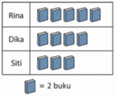 15. SD Mutiara mengadakan program pekan literasi. Selama pekan literasi, para siswa ditugaskan untuk mencatat jumlah buku yang mereka baca di rumah. Rina, Dika, dan Siti mencatat buku yang mereka baca dalam bentuk piktogram seperti pada gambar berikut.