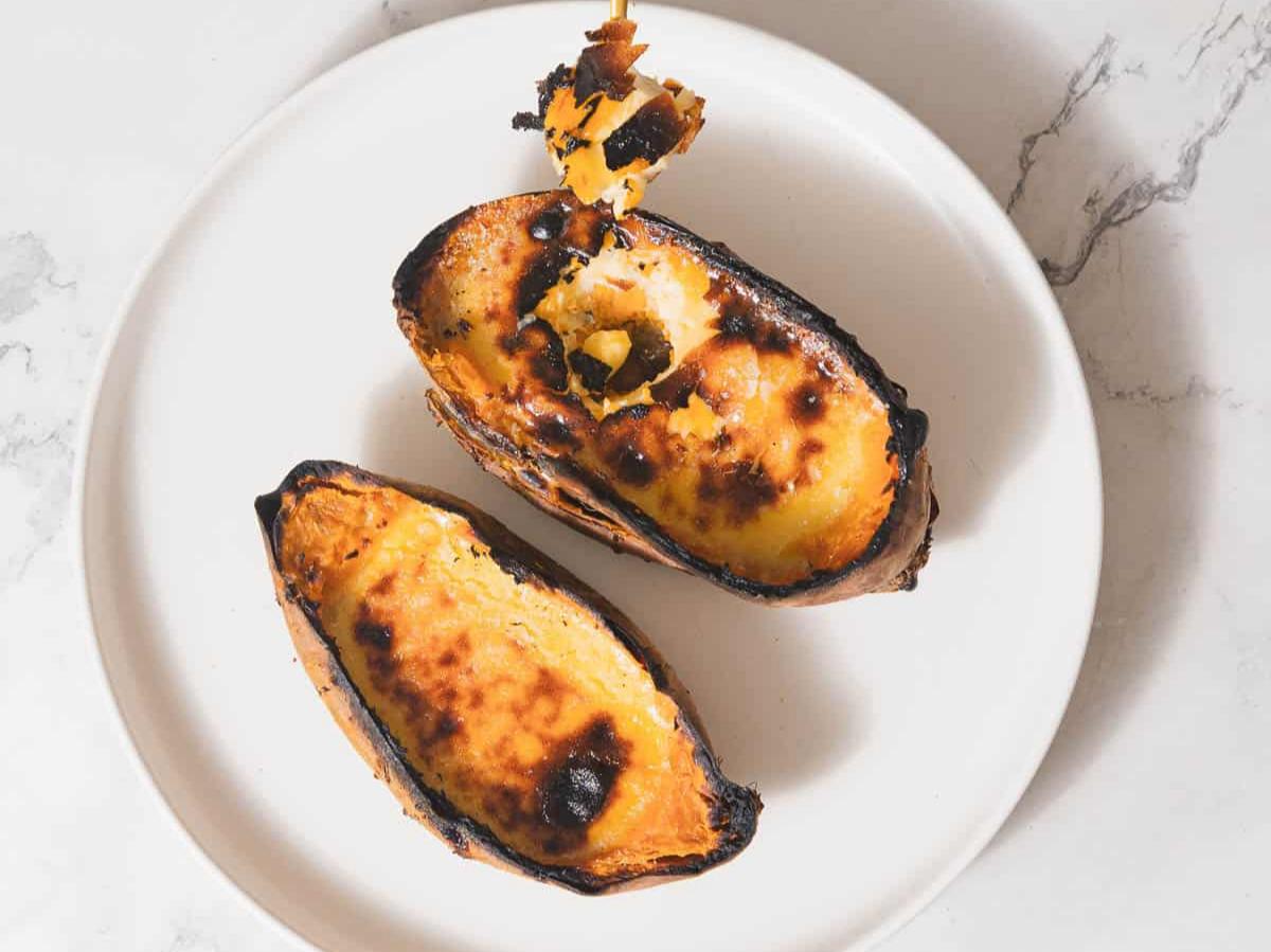 - Panggang ubi (200°C) selama 50 menit hingga matang. Potong sedikit bagian atasnya dan keruk untuk tempat brulee.