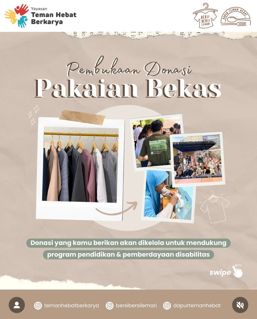 Mommies yang tinggal di Jakarta mungkin familier dengan yayasan satu ini karena di awal tahun 2026 mereka membuka boks drop-off baju bekas di stasiun MRT. Organisasi ini mengelola pakaian bekas untuk jadi barang berkualitas bersama yayasan disabilitas @temanhebatberkarya.